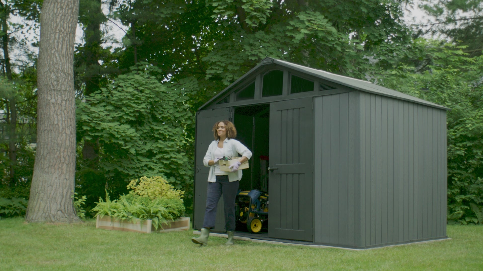 - included heavy duty floor panel can support ride-on mower and protects contents from mud and water